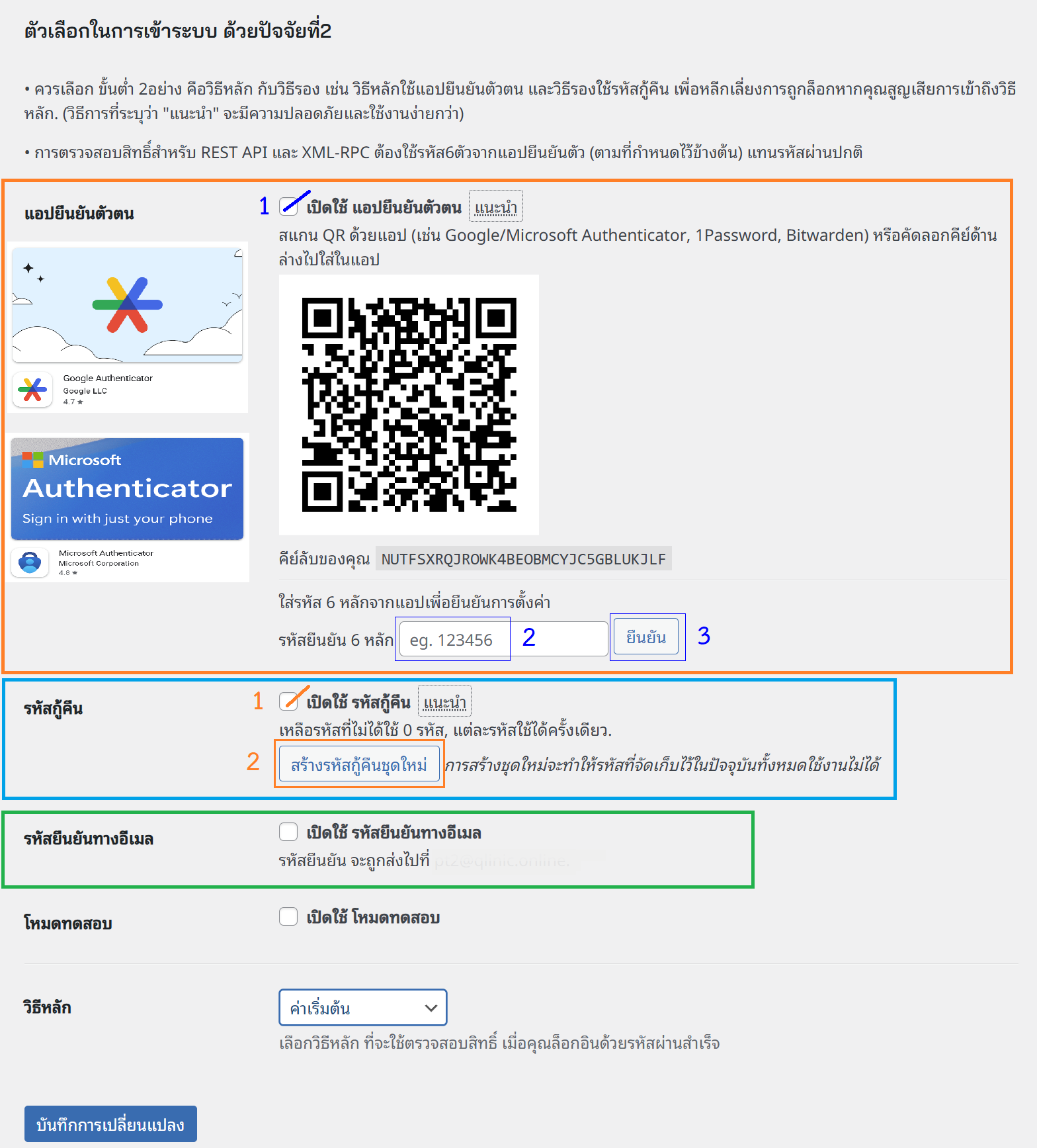 - ทำเครื่องหมายถูก ในช่องเปิดใช้แอปยืนยันตัวตน, และ ใช้แอปสแกน QR Code เพิ่มบัญชี