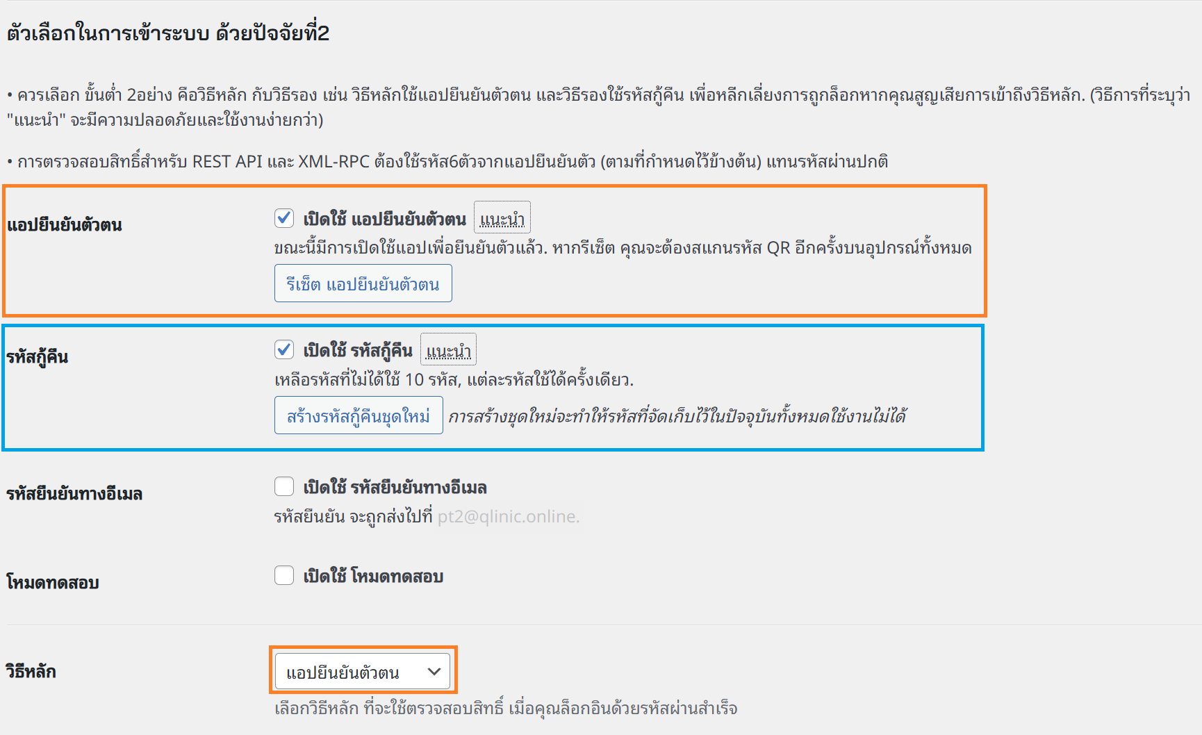 - เปิดใช้รหัสยืนยันทางอีเมล (วิธีนี้จะส่งรหัสที่ใช้งานครั้งเดียวไปให้ทางอีเมล เพื่อนำมาใช้เข้าระบบเป็นปัจจัยที่2)