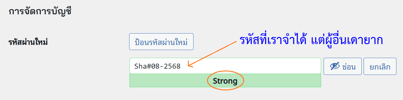- ใส่รหัสผ่านที่เราจำง่ายแต่ผู้อื่นคาดเดาได้ยาก (ควรมี ตัวอักษรใหญ่ เล็ก ตัวเลข อักขระพิเศษ), ให้แถบด้านล่างขึ้นแถบสีเขียว (Strong – รหัสผ่านคาดเดายาก)